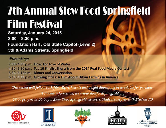 A film festival for everyone interested in learning about and supporting local food systems is planned for Saturday, January 24, 2015 in Foundation Hall at the Old State Capitol (Level 2) in Springfield from 2:00 – 8:30 p.m.Slow Food Springfield, University of Illinois Extension, Illinois Historic Preservation Agency, Old State Capitol Foundation and Grow Springfield are partnering to present the 7th Annual Slow Food Springfield Film Festival. “These films tell the stories behind our food and can increase awareness and interest in our food system,” says Deborah Cavanaugh-Grant, Local Food Systems and Small Farms Educator, University of Illinois Extension and chair for the festival.